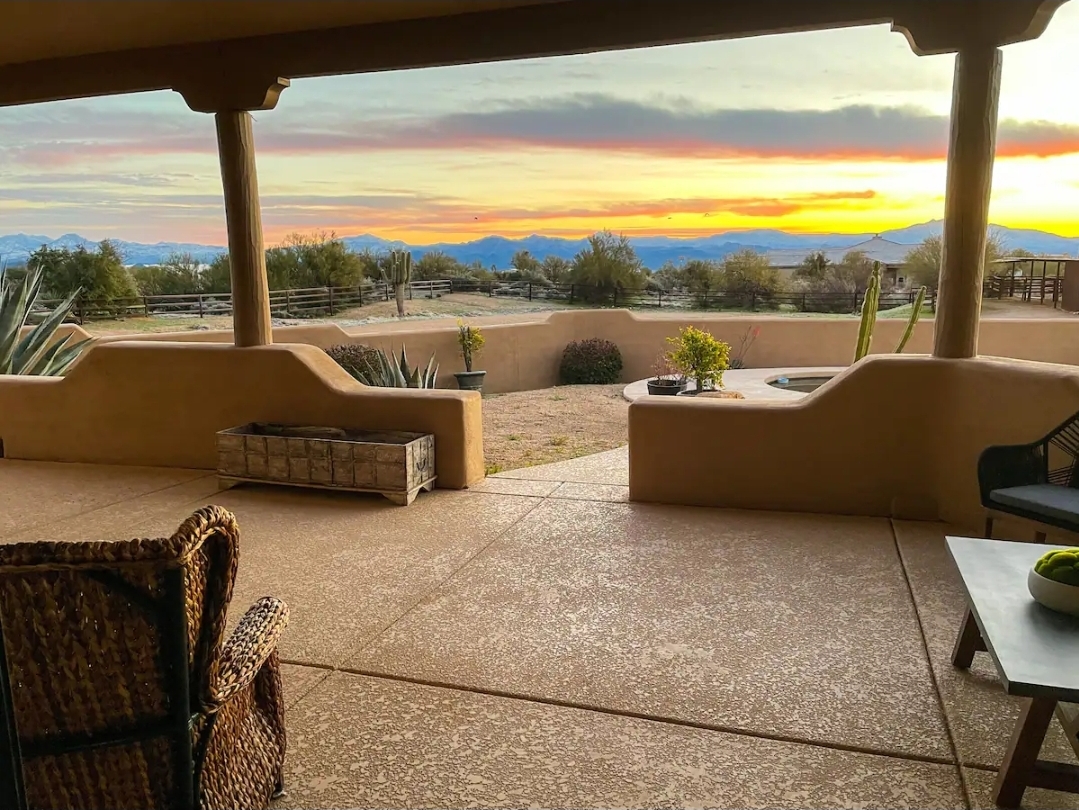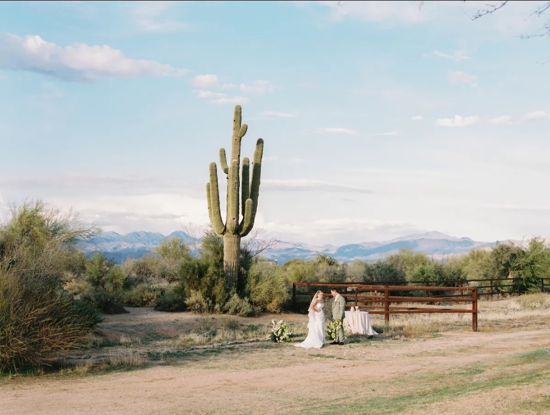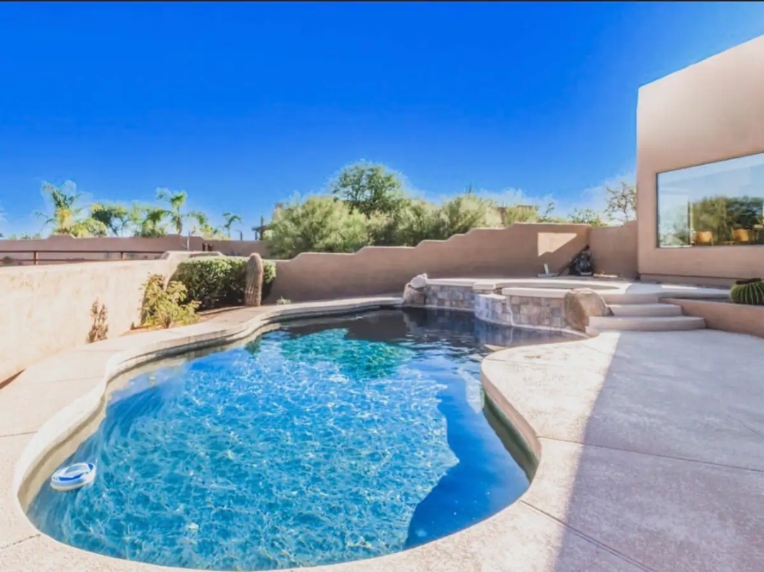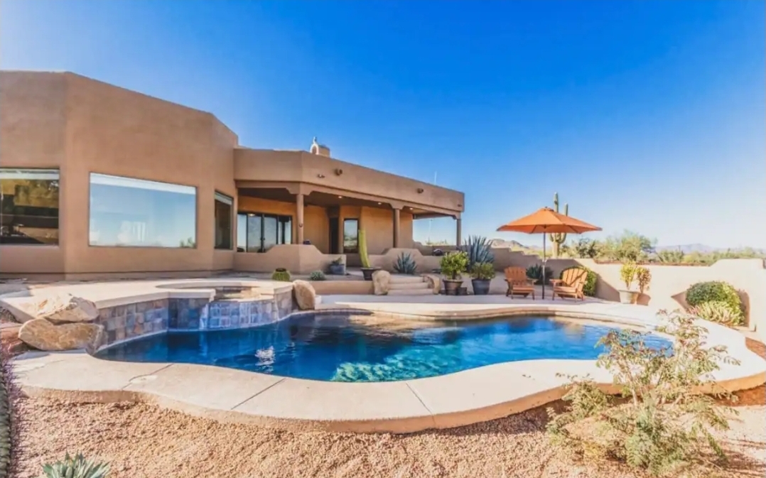 A stunning Arizona desert retreat featuring classic Southwest architecture, warm stucco finishes, and sweeping mountain views. This property offers a private backyard oasis with a sparkling pool, stone accents, and inviting patio spaces perfect for gathering. Surrounded by natural desert landscape and breathtaking sunsets, it’s a serene and picturesque setting ideal for unforgettable celebrations.